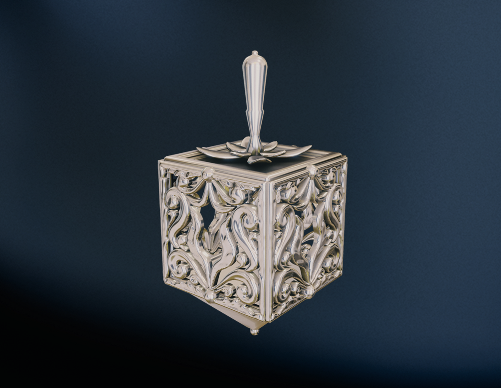 A dreidel made of silver with carved designs inspired by an existing design. Downloadable assets include PNG rendered images with transparent background in different angles.