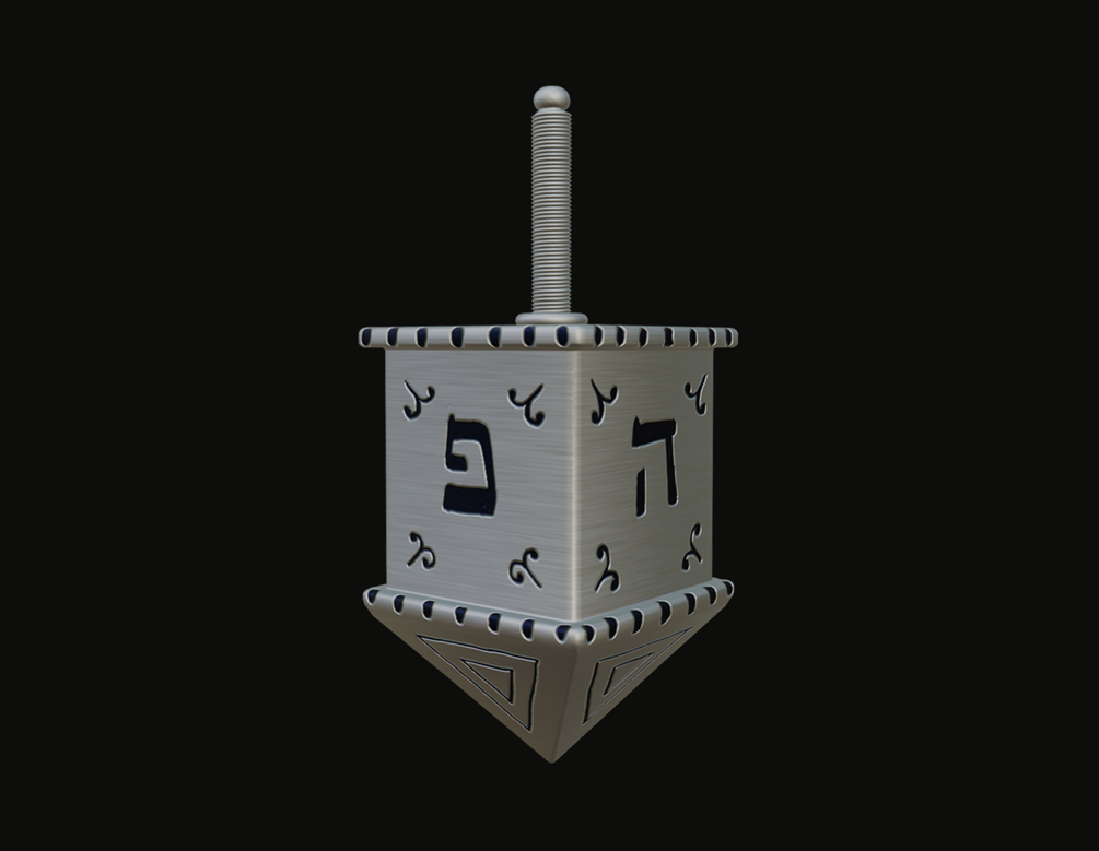 A dreidel made of brushed iron material, with etched designs inspired by an existing dreidel. Downloadable assets include PNG rendered images with transparent background in different angles.